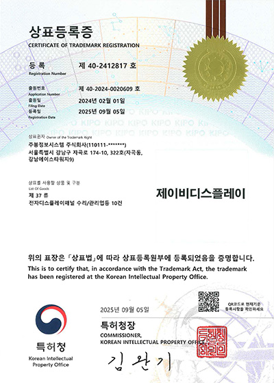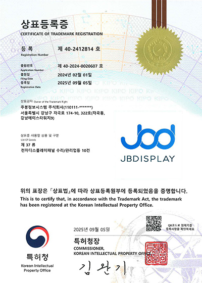 jbdisplay 상표권이 25년 09월 05일 최종적으로 등록되었음을 알려드립니다.